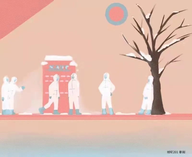 画面描述的是下雪后一起漫步在雪中的志愿者们,同时也祈愿这样的光景可以早日出现。