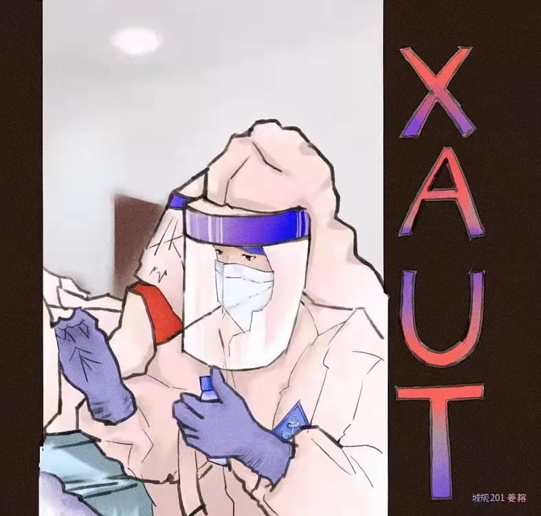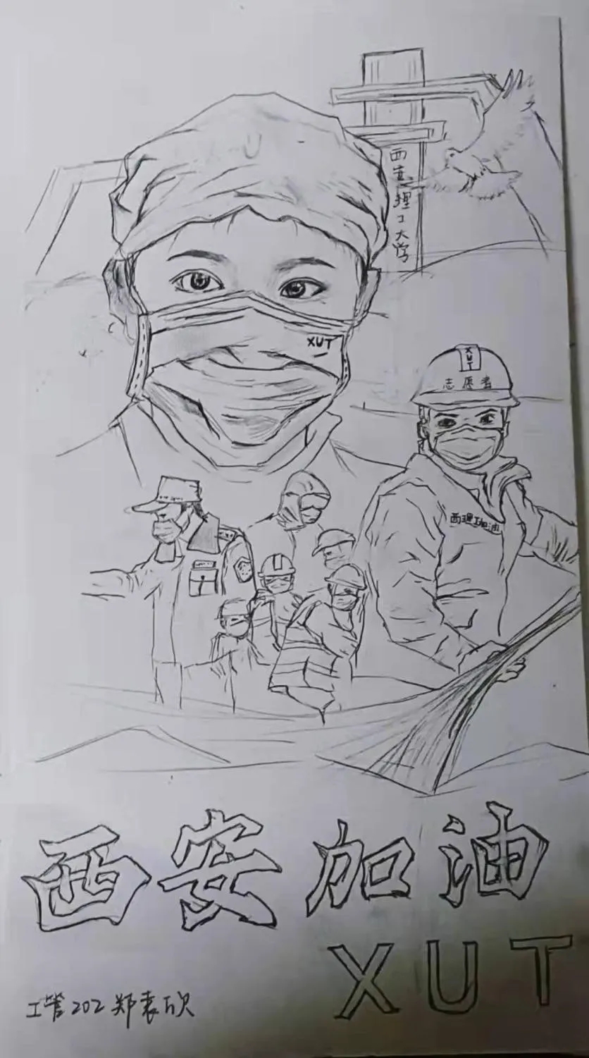 这幅画描述了疫情下的人们,有医生,有警察,还有志愿者们,大家都在努力抗疫,他们坚定的眼神让人们感觉无比心安。再加上西理工的元素,在疫情中西理工的每个人都在努力抗疫。右上角的白鸽象征着希望,我们一定会抗疫成功!西理工加油!西安加油!!!