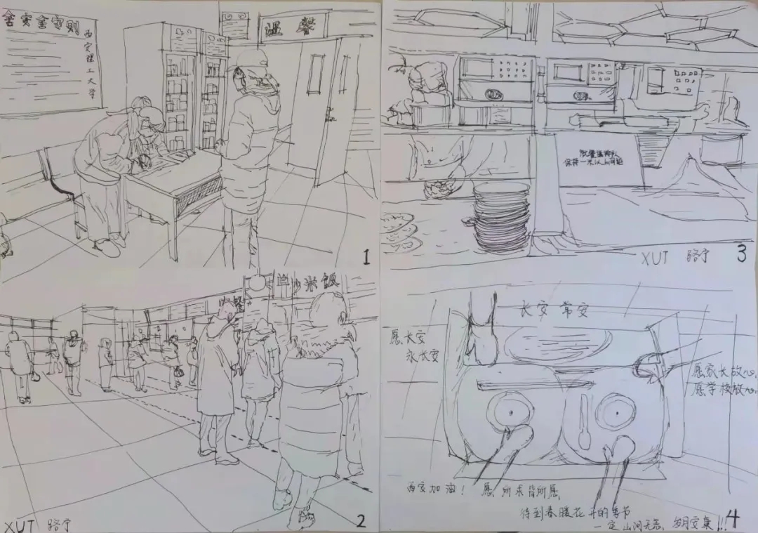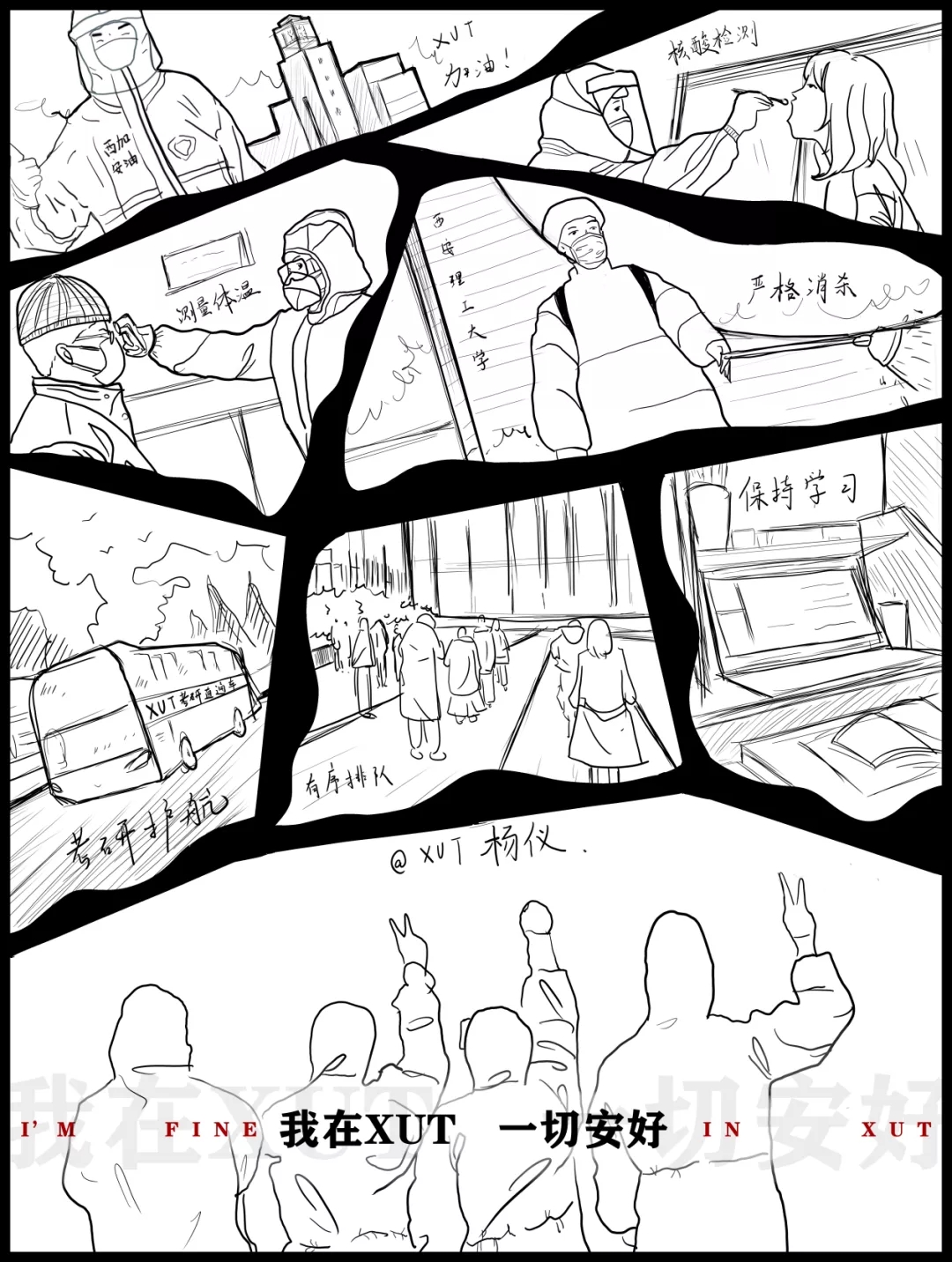 这幅漫画描绘了太阳成集团tyc122ccvip在防疫期间的日常小事,表现了我们井井有条的防疫生活和安全的校园环境。所以请家人安心,请公司放心,“我在XUT一切安好!”