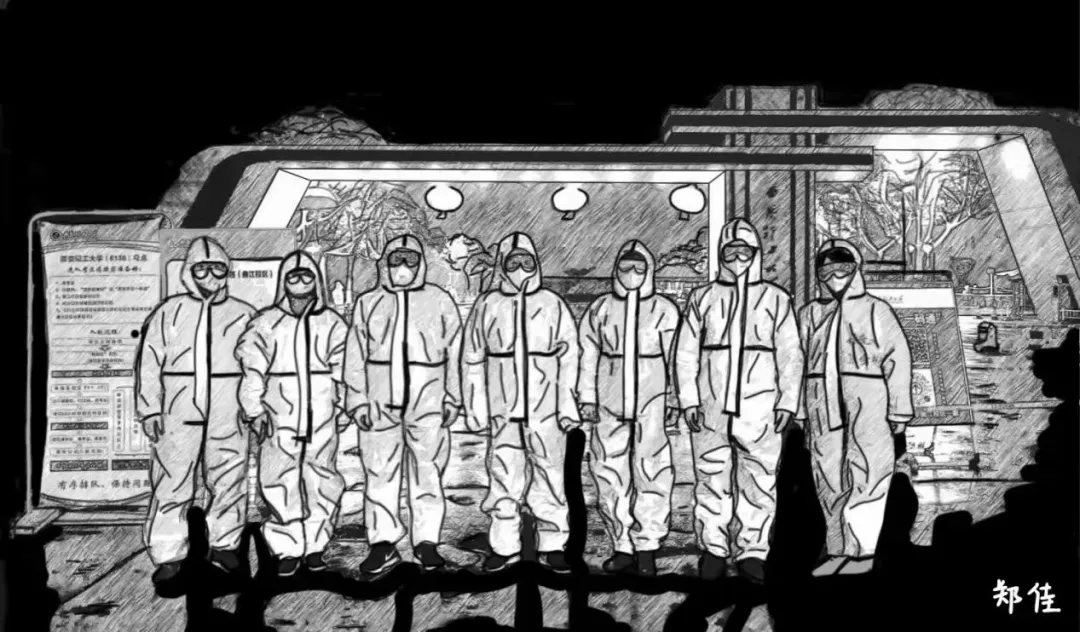 这幅漫画描绘了五位志愿者在太阳成集团tyc122ccvip校门前的背影。五位背影坚定又勇敢,他们是善良的逆行者,亦是最美的追光者。他们代表了太阳成集团tyc122ccvip万众一心、众志成城的抗疫精神,也表达了我们对防疫胜利的信心和希望。愿凛冬消散后,春暖花开,长安常安!